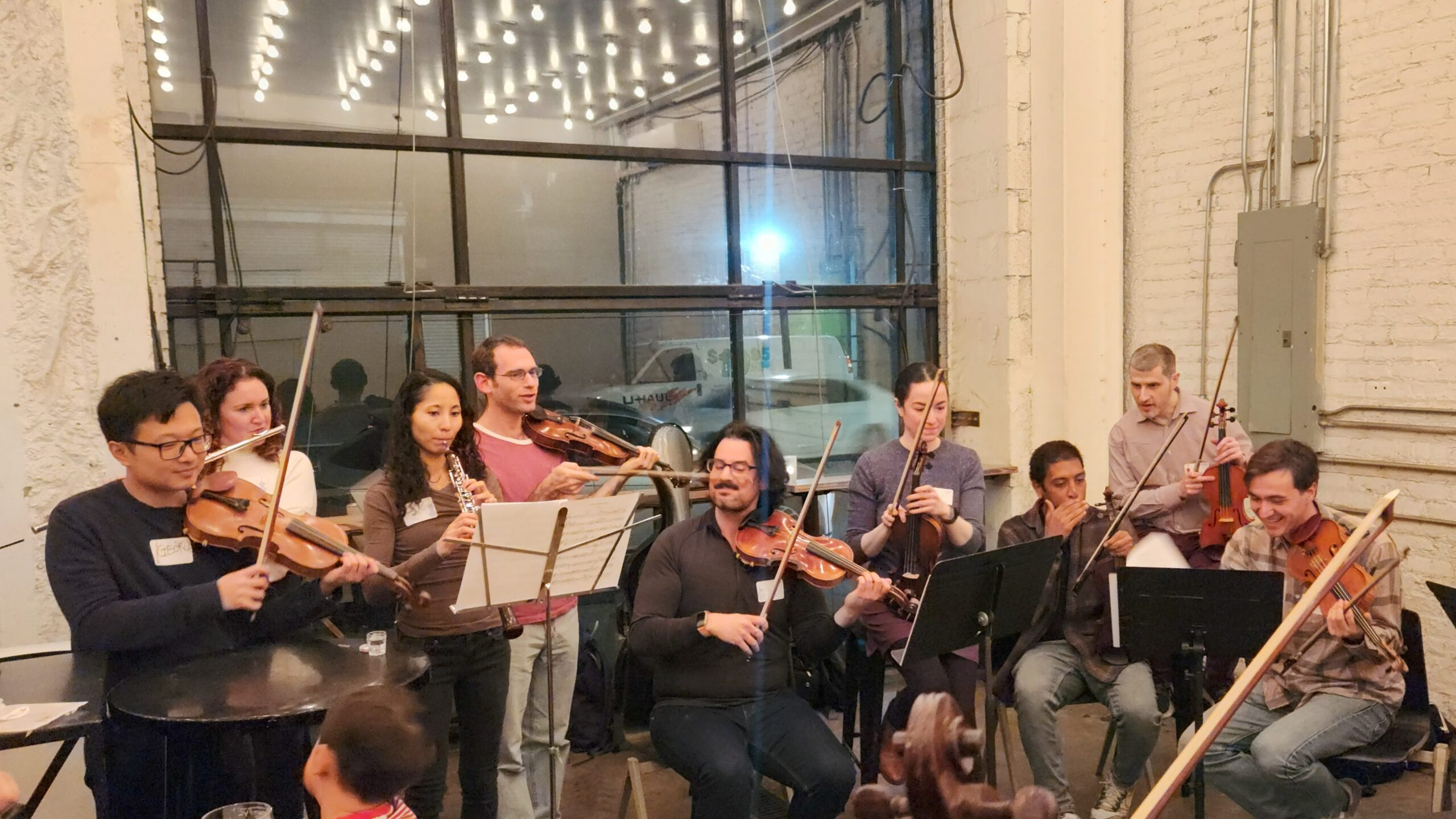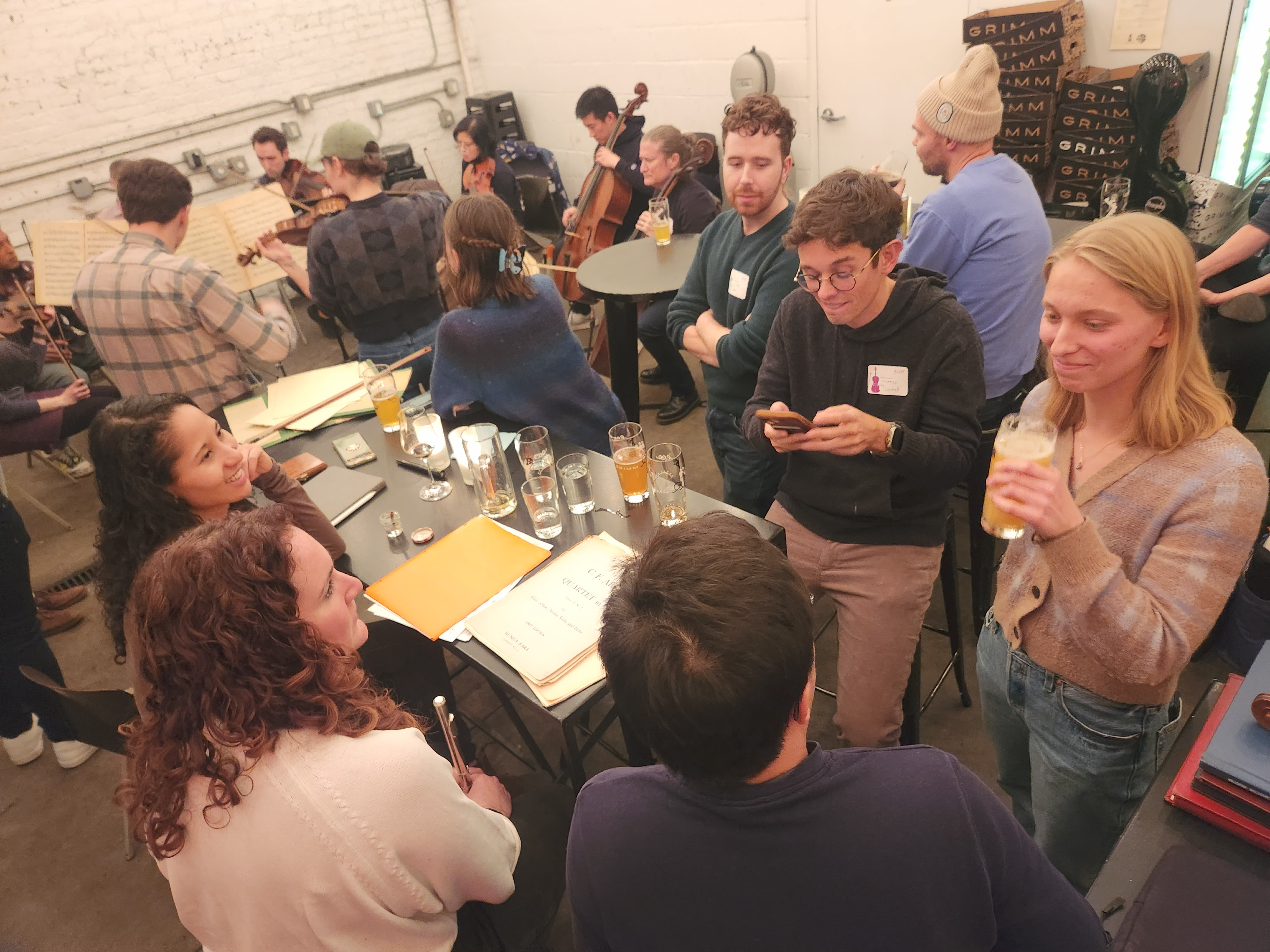 Have you ever played Mozart in the middle of a brewery just for fun? That’s exactly what happened in early January when local Young ACMP members met up at Grimm Ales in Brooklyn. We co-hosted the event with ACMP member Ben Bregman, who brought music, friends new to ACMP, and a few of his young students and their parents.